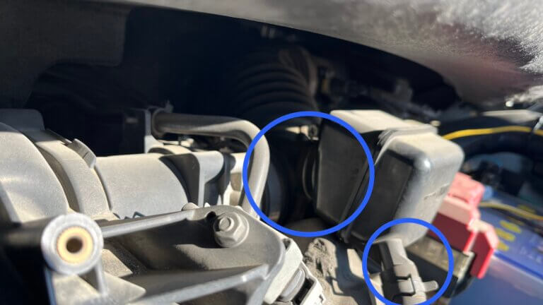 ソケットレンチとプライヤーを使ってスロットルボディー手前の青丸内のバンド2つを緩め、それぞれのホースを外す。