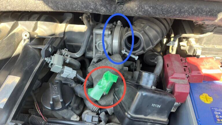 先程外した細い方のゴムホースにゴミが入らないように養生テープなどで塞いでおく。その後、スロットルボディーに固定してある青丸内のバンドを外す。