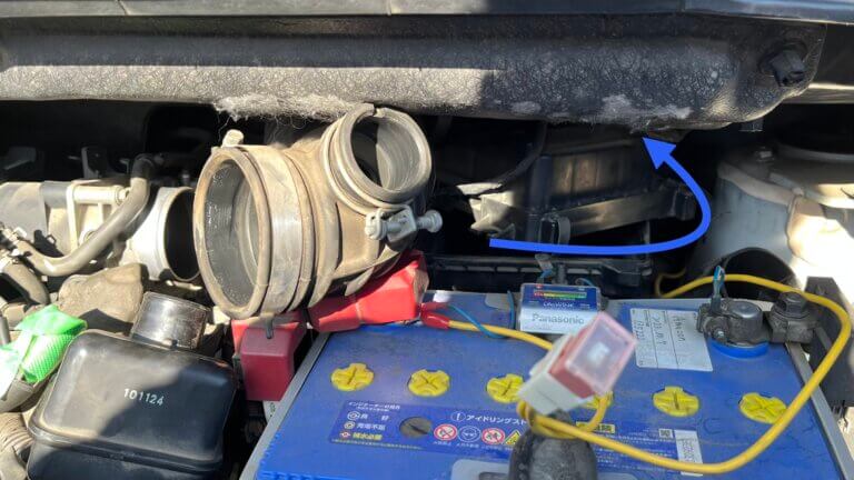 まず、エアクリ前のレゾネーターチャンバー(画像中央の箱)と吸気ダクトを外していく。