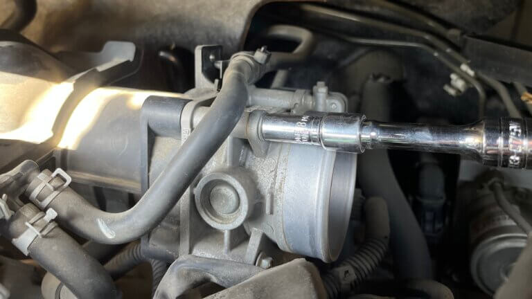 続いて、14㎜の薄型プラグソケットをエクステンションの先に取り付けプラグを外していく。プラグソケットはマグネット付きがおすすめ。