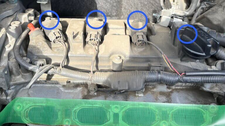 それぞれのボルトが奥まった所にあるので、エクステンションバーは必須!それから、青丸一番右端のボルト外しの時手前のケーブルが引っかかりとにかく邪魔になる。
