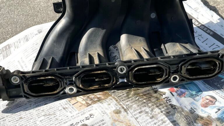 インマニの中はカーボンがべっとり。エンジンコンディショナーを吹き付け、時間をかけて溶かしていく。