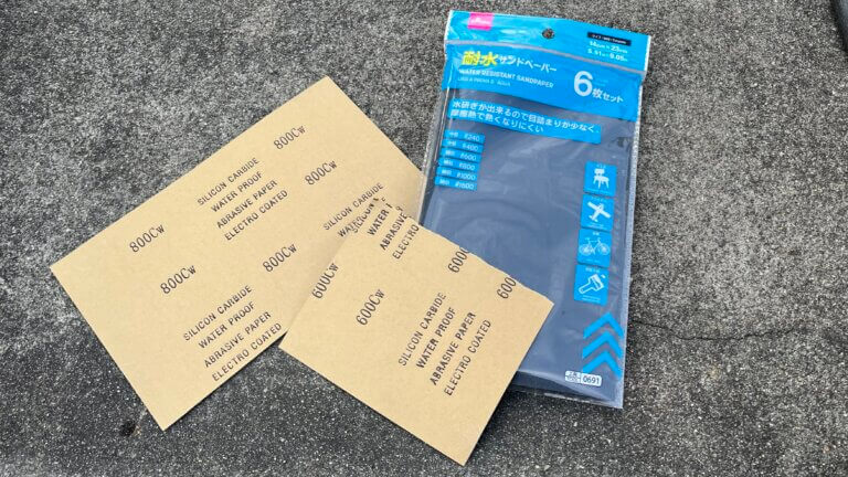 使用する耐水ペーパーはダイソーの耐水サンドペーパー6枚セット!中目#240からはじまり、#400、細目#600、#800、#1000、#1500までと幅広いラインナップ!