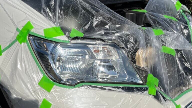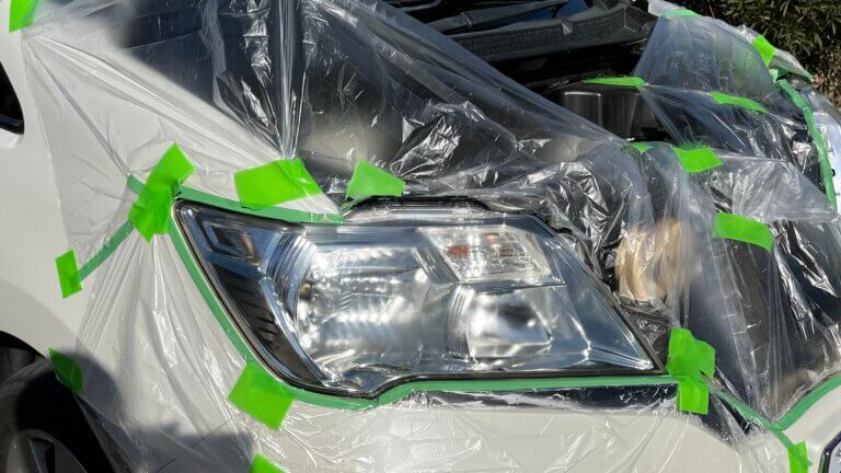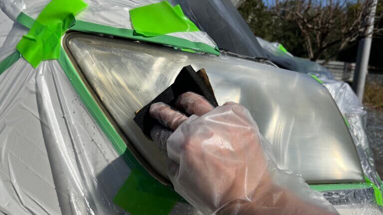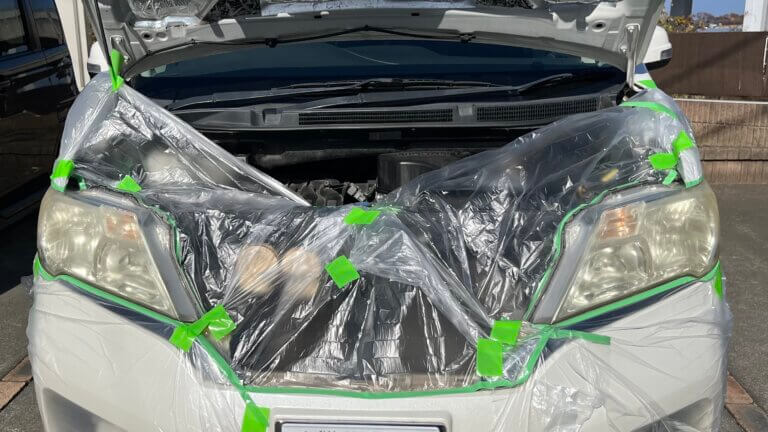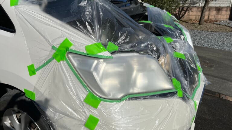 まずは養生。耐水ペーパーでヘッドライトの表面を削っていくので、周りのパーツを保護するためにマスキング!ペーパー掛け後にウレタン塗料をスプレーで吹き付けるので、ヘッドライト周りに付着しないようにマスカーテープで覆う。