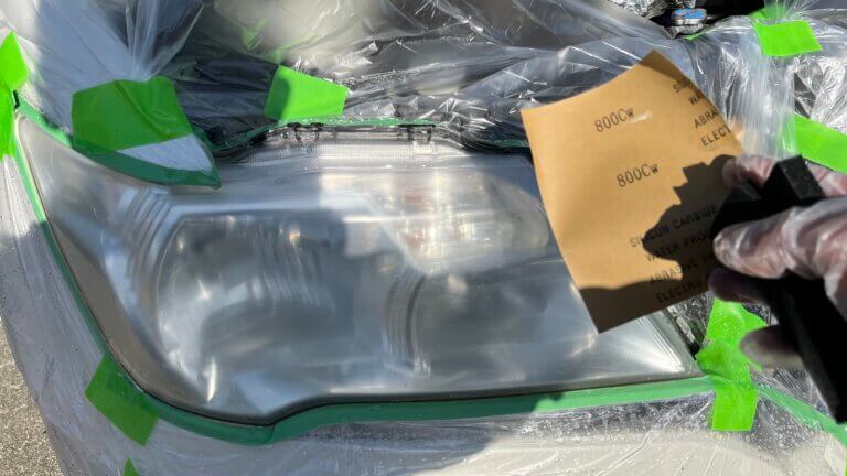 続いて#800を手に取りヘッドライト全体を削っていく。縦横斜めいろいろな方向から削り、ライト全体が均一に削れたら研ぎ汁が無くなるまで水ですすぐ。