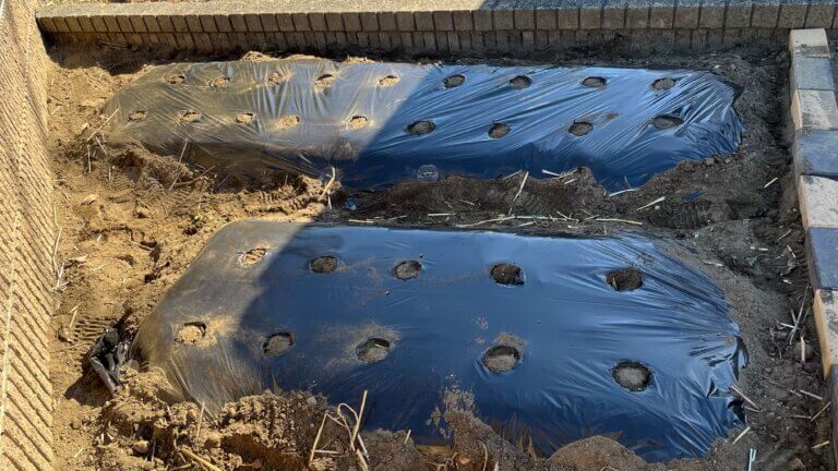 穴の切れ込みが等間隔で入っている穴あきマルチを使うと楽!切れ込みの内側を手でちぎるだけなので。そんな便利な穴あきマルチも時には追加の穴あけが必要な場合も!