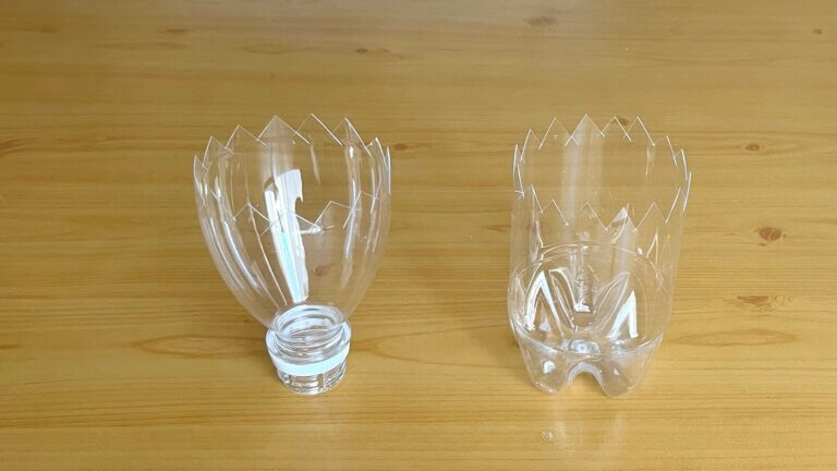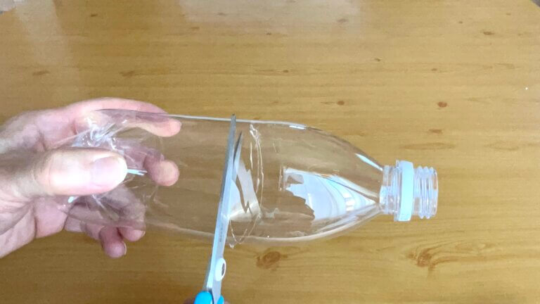 まずペットボトルをハサミで半分にカットしていく。ぐるっと一周線を引き、線に沿ってカッターで切ればまっすぐに切れるのだけど、今回はハサミだけ使う簡単な作り方ということで。