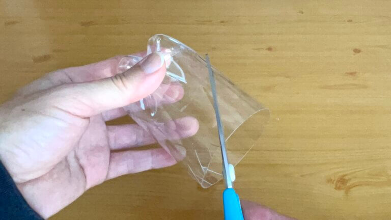次にカットしたペットボトルをハサミに対し左に45度ぐらい傾け、ペットボトルを回しながら上側をぐるっと一周切れ込みを入れていく。