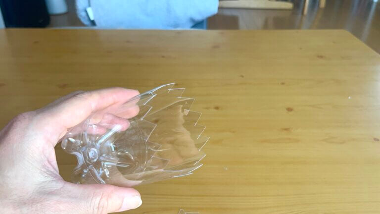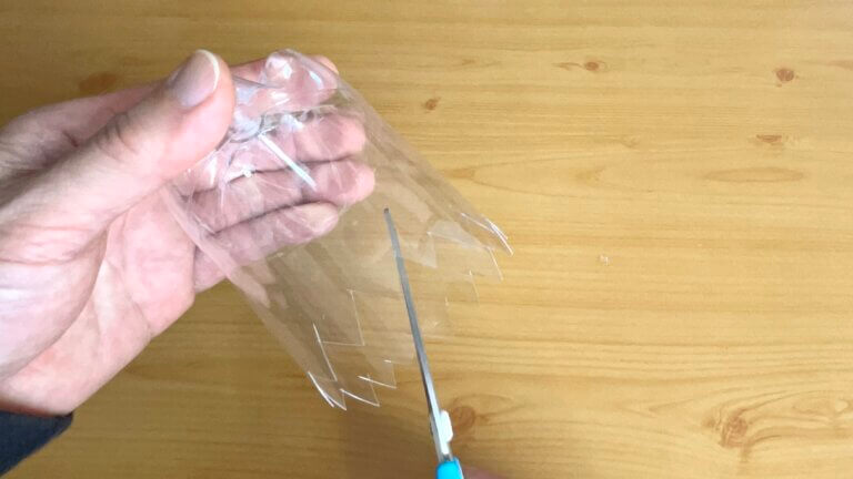 その後、ハサミをペットボトル下側にもっていきペットボトルを回しながら切り口がギザギザになるように一周カットしていく。
