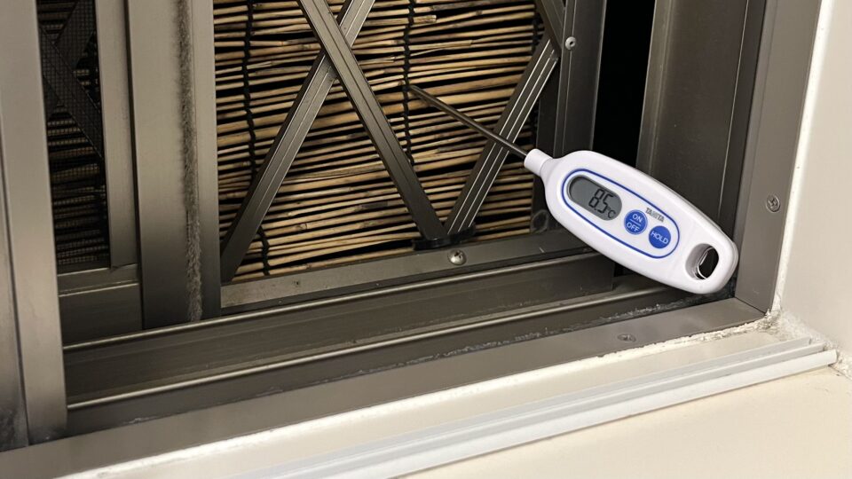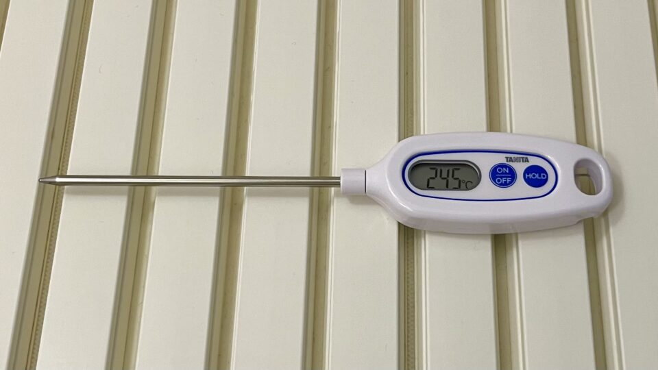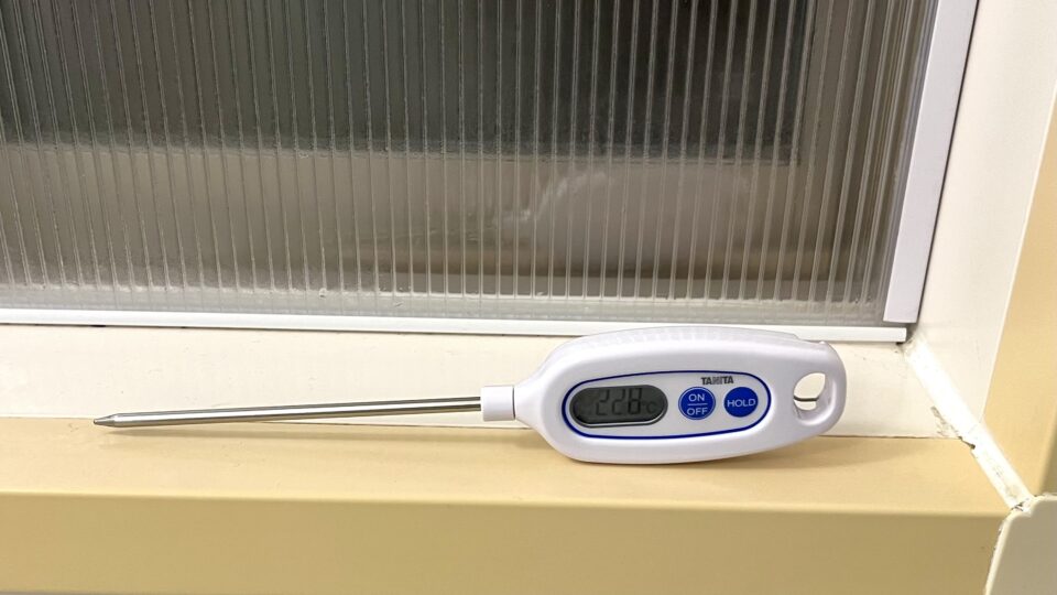 測定方法は、それぞれの測定位置に温度計を置き、温度変化が無くなった時点の数値を読み取る。温度計は信頼のおけるタニタの温度計。我が家ではキッチンスケール、子供部屋の温度計もタニタを使用。正確で素早い計測ができるので。