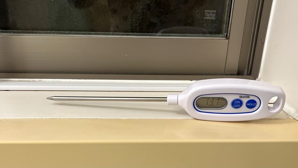 それから内窓の右半分を開け、温度を計る。温度計の数値がみるみる下がっていき安定したら読み取る。温度は13.1℃!